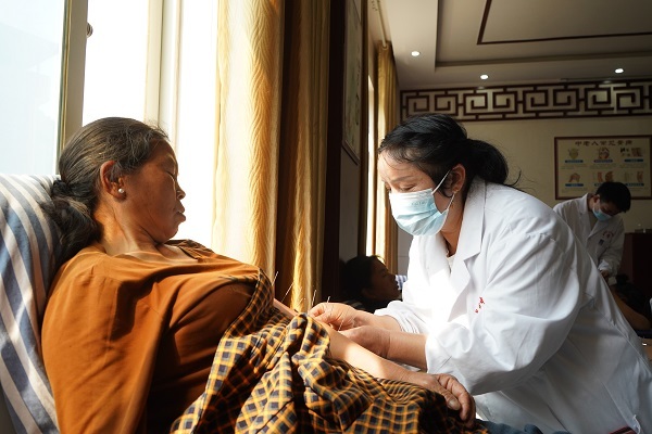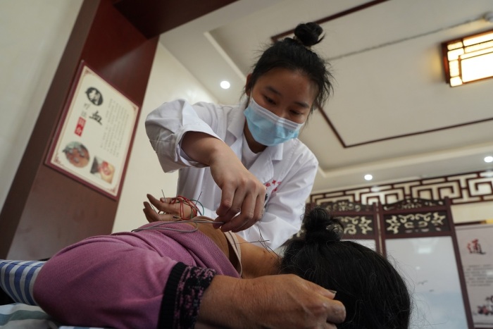 岑巩县龙田镇军屯村村民陆珍英在中医馆接受针灸治疗。(周燕 摄)