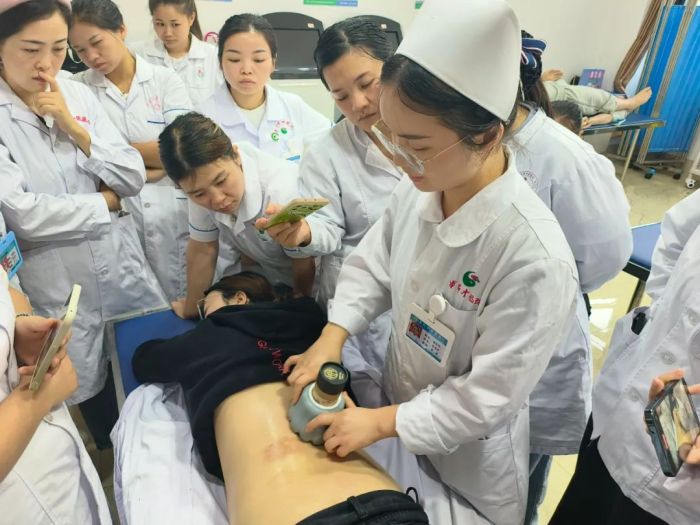 到骨伤科的第二年,陈丹去到中医学院进修专科护士,在学习的过程中,她发现医院与之存在的差距,从那以后,在交班中遇到的每个问题、每个词语,陈丹都要记下来弄懂,查资料,学习先进的理念,然后带回医院。回到医院后,骨伤科就引进了她当时学习到的理念,微查房、微课堂、每周微课堂学习回顾等,“作为专科的护理人员,要会打针输液,会做中医治疗,还需要学习专科病症等基础知识。”在不断的学习和提升下,骨伤科5个人的团队中,有7本专科证。