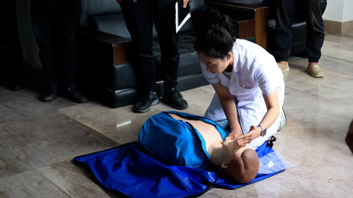 在应急救护知识技能培训中,三穗县人民医院的医护人员重点围绕止血包扎、心肺复苏等常见急救知识向在场人员作了讲解,并现场示范了胸外按压、人工呼吸等急救方法和技巧。通过理论讲解、实际操作等形式,以生动直观的演示和通俗易懂的话语,让大家学习并掌握了基本的救护知识和技能。