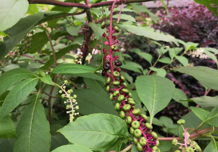 垂序商陆,因从北美引进又称“美洲商陆”,为国内常见的商陆品种。垂序商陆茎为红色,成熟后果序下垂,成熟果实呈紫黑色扁球形。垂序商陆全株有毒,误食后0.5-3小时发病,中毒者初期表现主要为体温升高、面红无汗、瞳孔放大、呼吸加速、呕吐、腹泻,继而眩晕头痛、言语不清、躁动抽搐,严重者甚至昏迷、死亡。