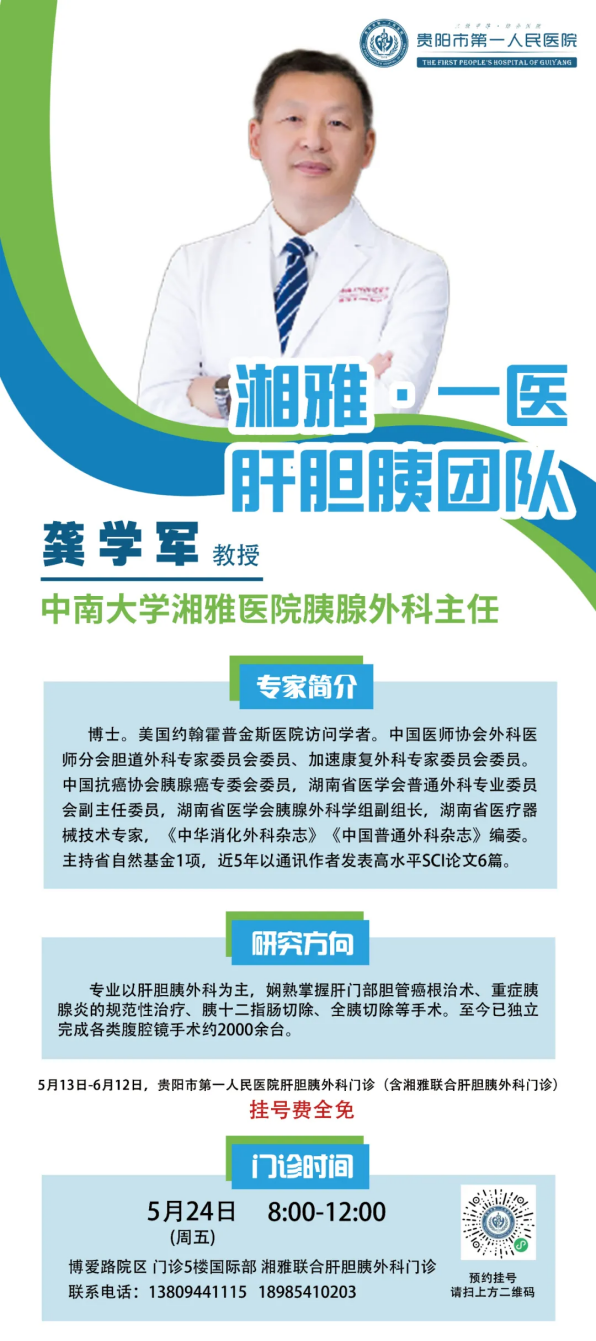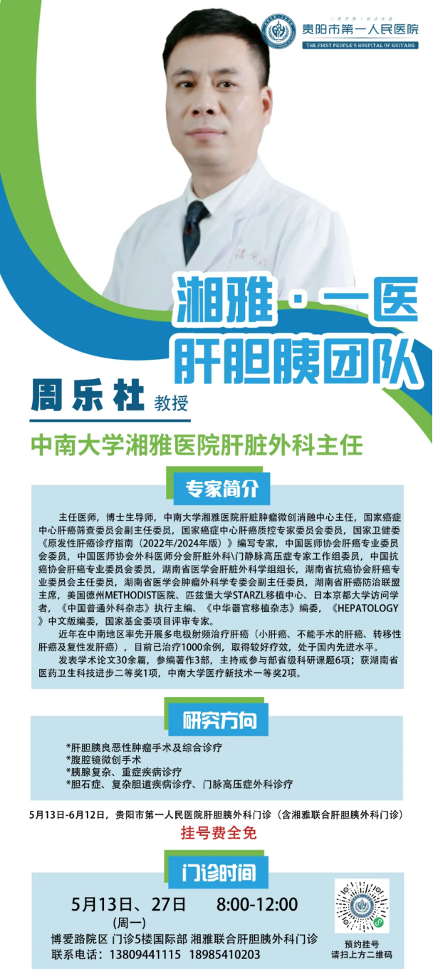 中南大学湘雅医院肝胆胰外科专家团队将莅临贵阳市第一人民医院坐诊并开展手术