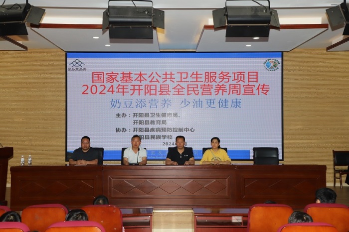 2024年5月13日-20日是全国第10届全民营养周,同时也是“5.20”中国学生营养日,今年营养周宣传口号是“健康中国、营养先行”,宣传主题是“奶豆添营养,少油更健康”。5月16日,在开阳县卫生健康局、开阳县教育局的联合组织下,开阳县疾病预防控制中心邀请省市疾控营养健康、食品安全的专家到开阳县第三中学、开阳县民族中学、开阳县东湖小学、开阳县楠木渡中心学校开展营养健康及食品安全的宣教。