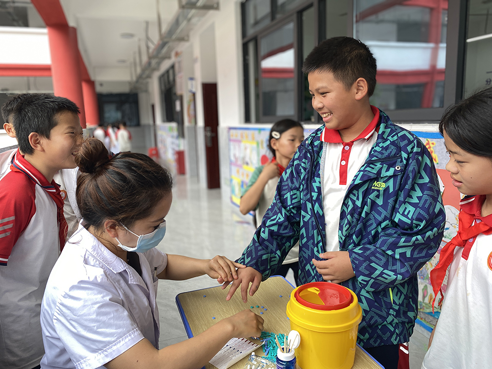 活动前,学校向各位家长分发乙肝抗体筛查通知书。检测现场,医护人员严格按照操作流程为学生登记、抽血,现场进行乙肝表面抗原抗体检测,对每位学生的检测情况进行仔细分析,分析整理后将此次筛查结果反馈给老师。同时,医护人员对学生用简单易懂的方式宣传普及乙肝常见知识。
