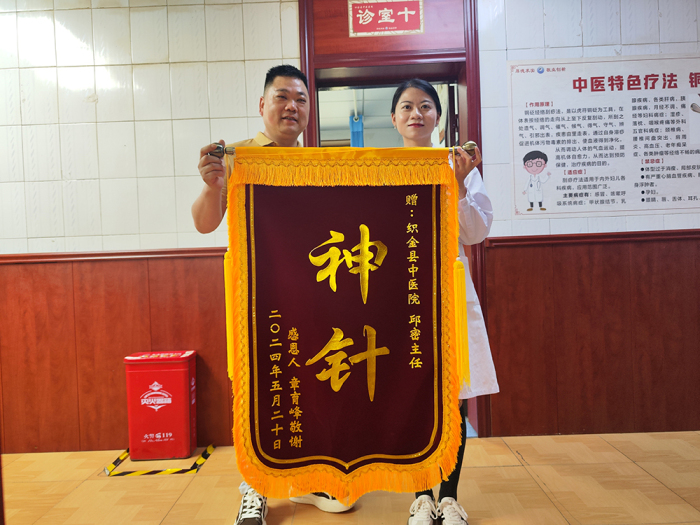 5月20日,心怀无尽感激的章先生特意制作了一面印着“神针”二字的锦旗,并携带工具来到织金县中医医院中医综合门诊十诊室。他快速地将这面满载感恩之情的锦旗挂到了诊室的墙上。