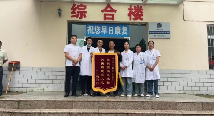 2024年6月3日上午,何大爷满怀感激之情,将一面写有“医德高尚医术精、关爱病患暖人心”的锦旗送到了乌当区新场镇卫生院中医科医护团队手中。