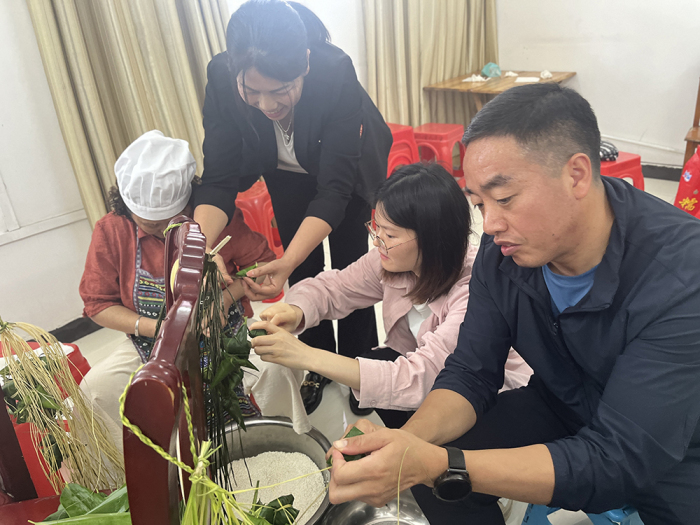 在包粽子环节,大家围坐在一起,热情高涨、兴致勃勃,纷纷拿出看家本领,捋粽叶、填糯米、压紧实、封口、扎捆,巧手翻飞,不一会儿功夫,一个个有棱有角、玲珑可爱的粽子就新鲜“出炉”了。大家边包粽子边分享经验,话家常、叙情谊,现场好不热闹。