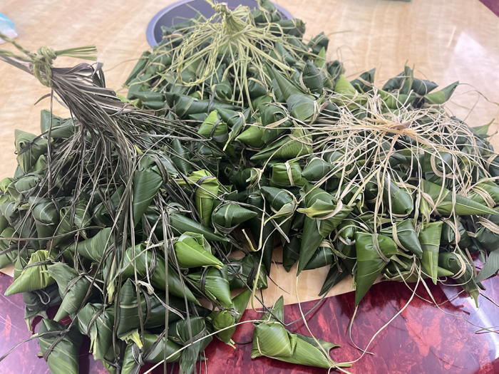 一大早,县卫生健康局食堂热闹非凡,离退休老同志早早地来到食堂,把洗好的糯米、粽叶等材料整齐地摆放在桌上,为包粽子提前做好准备工作。