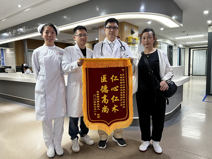 在医护团队的精心照护下,患者术后恢复良好,4个多小时开始麻醉苏醒,3天后脱离了呼吸机,第5天转回普通病房。经过一个周多的治疗与观察,目前患者已康复出院。为表谢意,临别之际,家属向贵医附院心脏大血管外科的医护团队送上了“仁心仁术,医德高尚”的锦旗。