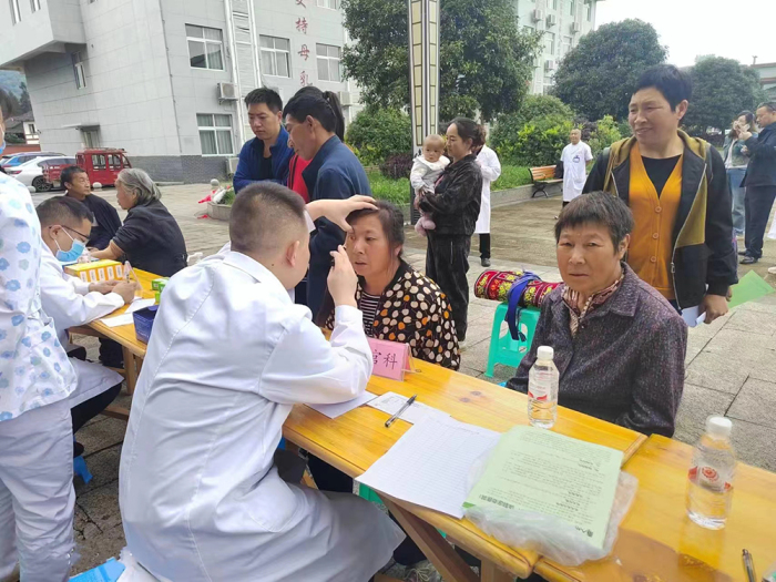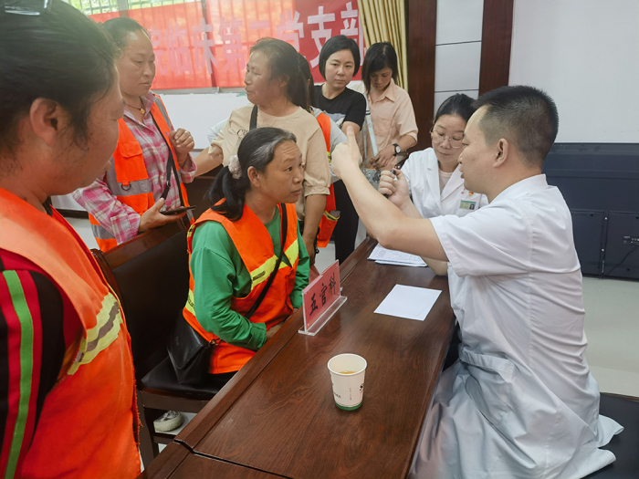 余庆县人民医院组织外科、内科、五官科、康复科、超声科、药剂科的专家到子营社区为环卫工人开展一对一面诊,仔细检查环卫工人身体健康状况,耐心解答健康问题并进行健康指导。
