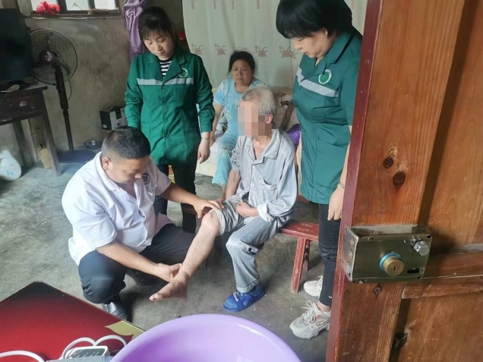 家住缠溪镇双龙村的70岁邱爷爷患有老年痴呆,是一位生活不能自理需长期卧床的老人。近日,付医生带领团队上门为老人进行康复训练,详细询问老人的身体健康状况、用药情况和饮食作息习惯,为其进行心肺听诊、测量血压、四肢运动功能等详细检查。因老人长期卧床,在检查过程中还和家属重点讲解了护理建议、日常饮食及预防跌倒等注意事项,并提示有问题时可以随时微信或打电话,他们随时上门提供服务。