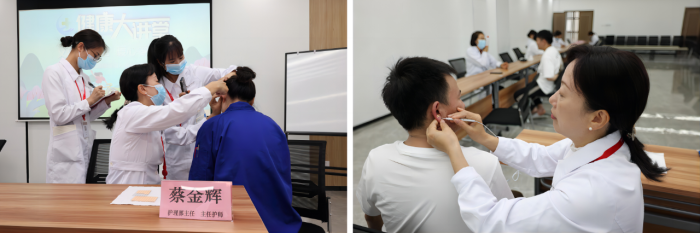 中山一院贵州医院护理部主任蔡金辉擅长耳穴诊治高血压、失眠、感冒、鼻炎等症状,在详细了解员工问题后,现场为患者进行耳穴诊治,将敷贴精准贴于患者耳部的穴位之上,再通过刺激穴位的方式,让患者的症状得以缓解和消除,同时还现场为患者讲解后续治疗方案,普及各类健康知识。