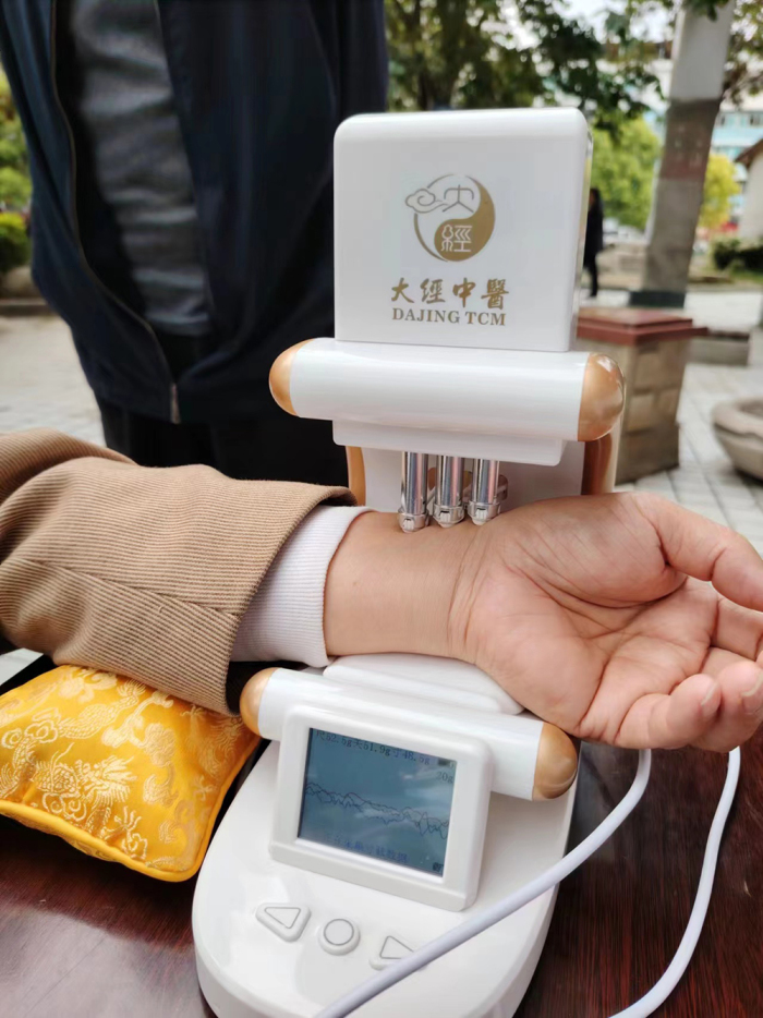 脉诊是中医诊断学四诊之一,是一种特殊的诊疗方式。为龙老伯进行体质辨别的脉诊仪基于中医脉诊理论,通过传感器精准模拟中医切诊指法,采集分析脉象的位、数、形、势特征,最终智能分析出单脉与相兼脉类别并输出标准的脉象图,并进行诊断,继而提出调理建议。