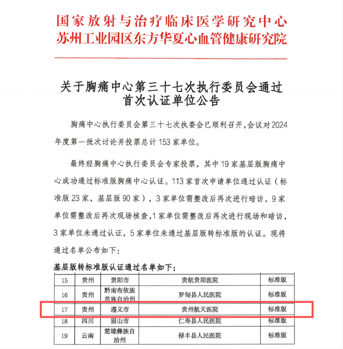 6月19日,经过严格评审,中国胸痛中心总部发布《关于胸痛中心第三十七次执行委员会通过首次认证单位公告》,贵州航天医院胸痛中心成功通过国家级胸痛中心标准版认证,标志着贵州航天医院胸痛中心建设水平和急危重症救治水平再上新台阶。