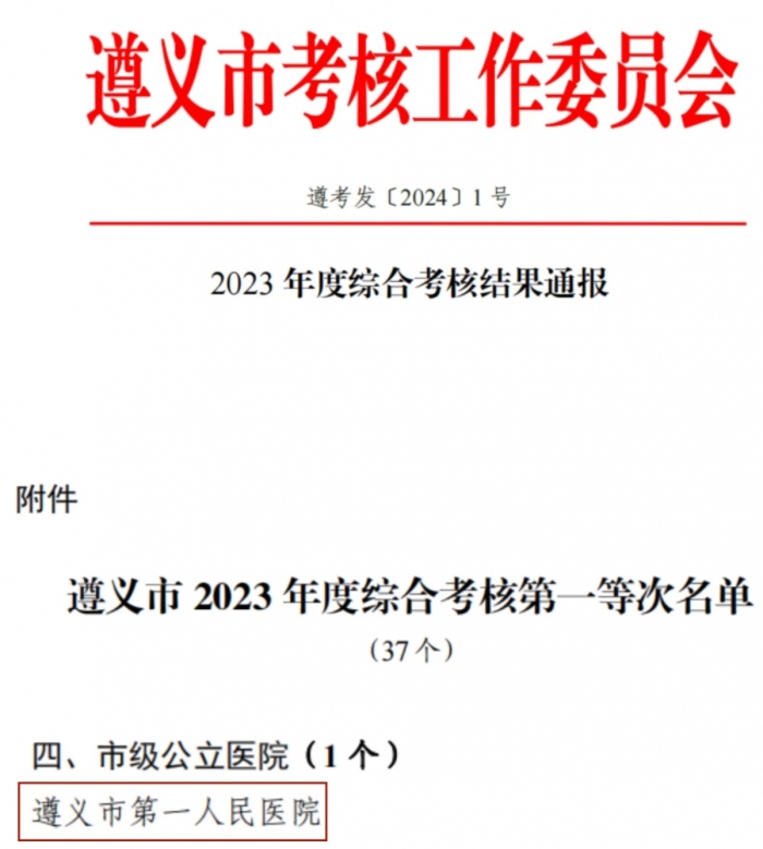 遵义市第一人民医院荣获2023年度市级综合考核“第一等次 ”