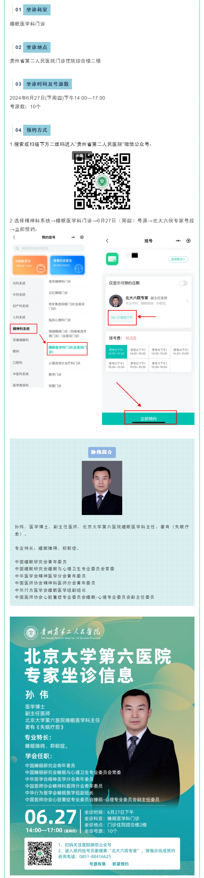 首页 > 新闻中心 > 卫生工作动态 > 正文 大咖来啦!北京大学第六医院睡眠医学科主任孙伟博士将到贵州省第二人民医院坐诊 来源:贵州健康报 时间:2024-06-22 浏览次数: 好消息!!!6月27日下午,北京大学第六医院睡眠医学科主任、医学博士孙伟受邀到贵州省第二人民医院睡眠医学科门诊坐诊。目前,孙伟主任的预约号已开通,有需求的病友可通过贵州省第二人民医院微信公众号提前预约。(来源:贵州省第二人民医院)编 辑:石 磊二 审:文 叶三 审:高学军 分享到: