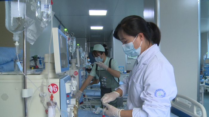 在余庆县松烟中心卫生院血透室,医护人员正忙着准备透析用物、管路安装预充,然后有序组织患者穿刺上机、监测血压等操作,让患者能够按时完成血液透析治疗。