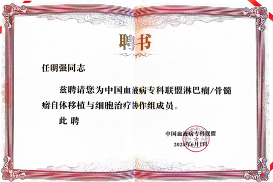 2024年6月1日,中国医学科学院血液病医院淋巴肿瘤诊疗中心牵头成立中国血液病专科联盟淋巴瘤/骨髓瘤自体移植与细胞治疗协作组,遵义医科大学附属医院血液内科成为全国44家首批协作组成员单位之一,血液内科副主任任明强教授被聘为全国淋巴瘤/骨髓瘤自体移植与细胞治疗协作组专家成员,这是对医院血液内科淋巴瘤/骨髓瘤诊治能力的肯定,有助于进一步规范和推动遵义及黔北周边地区淋巴瘤/骨髓瘤自体移植与细胞治疗能力的整体发展,造福更多血液病患者。