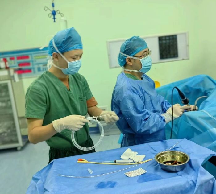 入院后,外三科主任何朝武通过术前检查及评估,考虑黄先生右肾结石过多并积水,一次手术无法完全清除,在与家属充分沟通后,何朝武很快为黄先生制定了详细的手术方案。在麻醉下行一期“经输尿管镜检查+右侧输尿管狭窄扩张+输尿管软镜钦激光碎石+输尿管支架置入术”。术后效果良好,大部分结石已清除,梗阻解除。