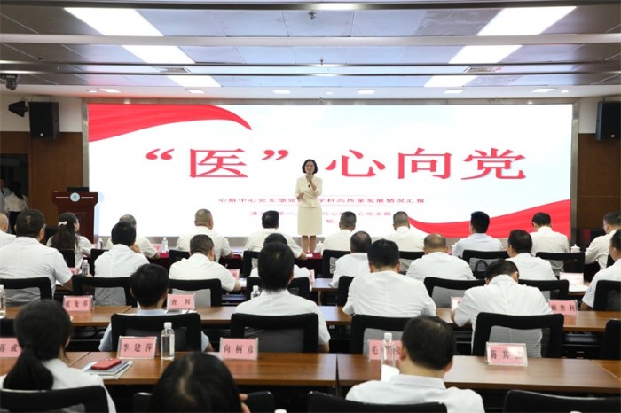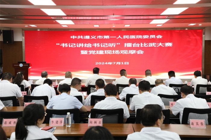 为庆祝中国共产党成立103周年,推动医院各基层党组织党建工作提质升级,7月1日,遵义市第一人民医院党委举行“书记讲给书记听”擂台比武大赛暨党建现场观摩会。遵义市卫生健康局党委副书记、副局长段永华,遵义市委组织部科室负责同志,遵义市第一人民医院党委书记王天培,党委副书记、院长袁正强及全体党委领导班子、各党支部书记、中层干部参加。 会议由院党委副书记袁建平主持。