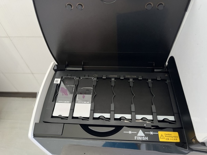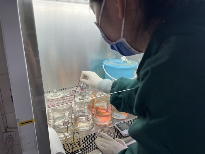 7月8日,病理科医护人员对标本进行快速染色。(陈治娟 摄)