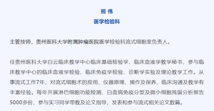 贵州医科大学附属肿瘤医院医学检验科开展流式细胞术除TNBK检测外,还开展淋巴细胞精细亚群、白血病免疫分型、多发性骨髓瘤、微小细胞残留分析、PNH、B27、细胞因子等。