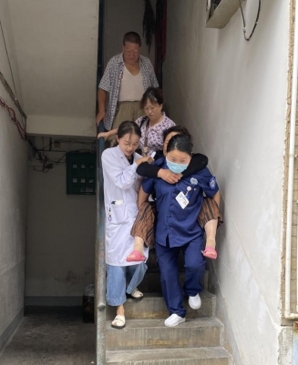 由于余女士已经出现头晕、恶心呕吐、乏力、无法行走等症状且该小区为老旧小区,没有电梯又住在3楼。楼道狭窄,救援担架无法在转弯处使用,现在只有将患者背下楼。余女士家属年龄偏大无法胜任。紧急时刻,金雪挺身而出,毫不犹豫地背起了病人。从三楼背到一楼,近百个台阶。金雪额头上的汗珠顺着她的脸庞滴落到台阶上。尽管这样,也丝毫没有影响到她背着病人下楼的速度。最终在医护人员的密切配合下,病人被安全转运至医院并得到了及时的医治。