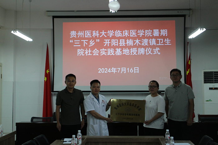 交流座谈会上,楠木渡镇卫生院汇报了医院基本情况和人才需求情况,贵州医科大学临床医学院介绍了学院办学情况,并授予楠木渡镇卫生院为“贵州医科大学临床医学院三下乡社会实践活动基地”。
