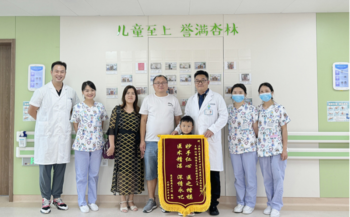 术后一周,雷雷完全康复出院了。出院当天,雷雷父母为儿童神经外科团队送来锦旗表示感谢。