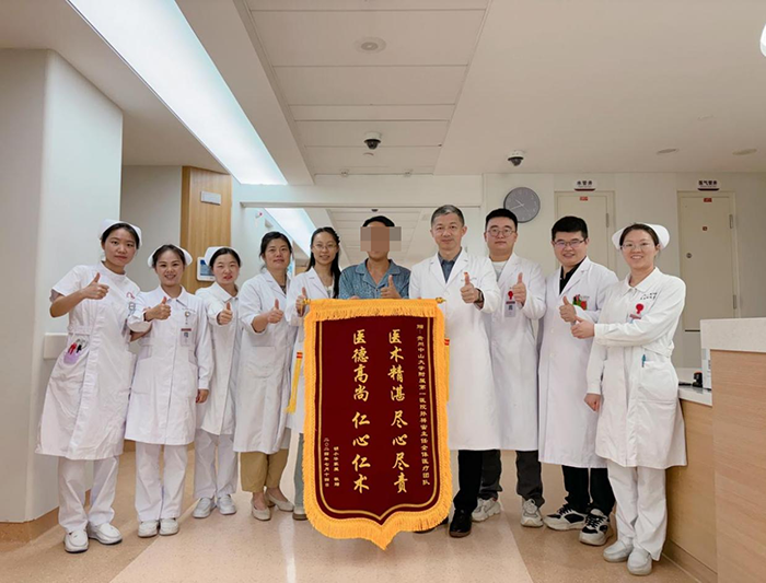 为感谢孙祥宙团队的精心治疗,患者为泌尿外科团队送了一面写有“医术精湛、尽心尽责、医德高尚、仁心仁术”的锦旗。“非常感谢孙祥宙教授和泌尿外科的医护人员,没想到我在贵州就能得到广东中山一院专家的治疗,孙教授医疗技术真的很厉害,当时得知是他开展手术我就毫不犹豫选择在这里进行治疗,事实证明我的选择没有错。”患者送锦旗时表示。