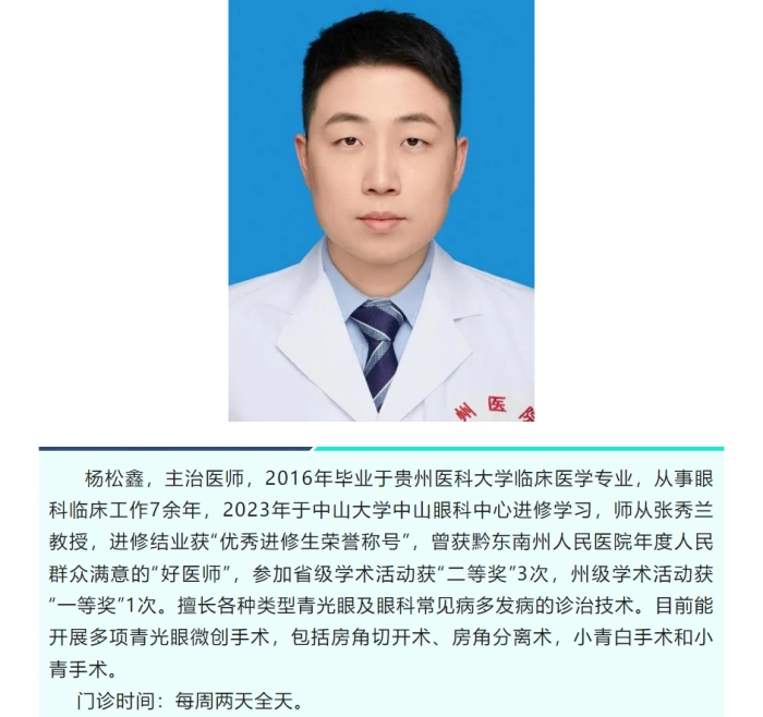 眼科主治医师杨松鑫于2023年10月至12月跟随张秀兰教授学习,于本月初学成将此技术带回我院,黔东南州人民医院(眼科专家团队将竭诚为广大青光眼患者开设门诊和开展微创手术服务。