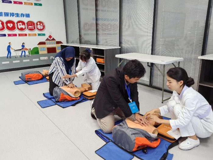 借助贵州护理职业技术学院得天独厚的地理优势,立足办学特色,依托“一寨一区四基地”,即一寨:中国少数民族特色村寨——音寨;一区:国家AAAA级风景名胜区——金海雪山;四基地:急危重症虚拟仿真产教融合实训基地、贵州省科普教育基地、贵州省中小学生职业体验基地、贵州省中华优秀传统文化传承基地。实施“学院+旅游资源”模式,校旅结合,打造学院国际人文交流研学品牌。首先,研学团前往教育部职业教育示范性虚拟仿真实训基地——急危重症虚拟仿真产教融合实训基地。师生详细介绍并演示了沉浸式灾难急救训练系统、创伤救护CR体验项目、蛇咬伤桌面式急救游戏、虚拟ICU,并讲授《Cardiopulmonary Resuscitation 》课程。期间,学生进行了心肺复苏展示、研学团代表进行VR体验和心肺复苏模拟练习。他们对虚拟仿真资源给学习带来的新体验,赞不绝口。