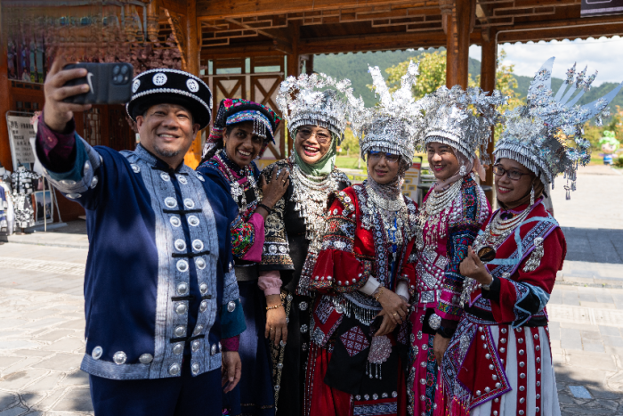 最后,来到了贵州护理职业技术学院省级中华优秀传统文化传承基地、中国少数民族特色村寨——音寨。布依族同胞用最热情的“拦门酒”仪式欢迎远道而来朋友。研学团亲身体验了布依族服饰、竹竿舞、打糍粑,感受贵州护理职业技术学院师生的满满热情。研学团乘坐观光小火车,游览国家AAAA级风景名胜区——金海雪山。通过民族文化活动游、民族文化体验游,体会民族文化特色,感受中国民俗风情。