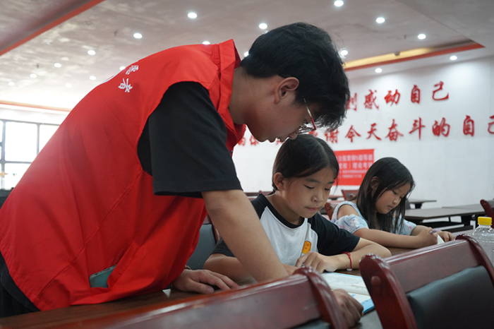 岑巩县大有镇大坪同心社区的儿童之家,志愿者夏先进在给社区孩童辅导暑假作业。(陈昆 摄)