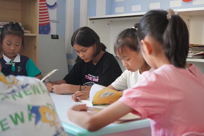 舒泓钧(左二)在社区的儿童之家翻看喜欢的书籍。(陈昆 摄)