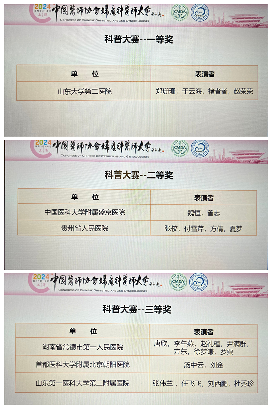 8月1日至4日,由中国医师协会、中国医师协会妇产科医师分会主办,上海市医师协会妇产科医师分会、上海交通大学医学院附属仁济医院承办的“2024中国医师协会妇产科医师大会科普大赛”在上海市举办,贵州省人民医院产科喜获二等奖。