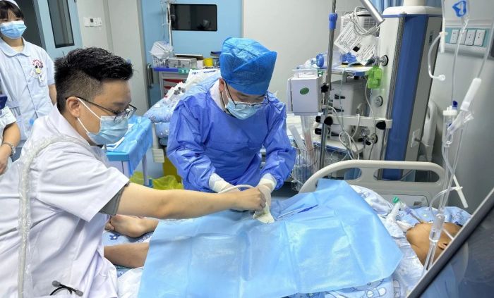 患儿小雨(化名),10周岁,因突发意识障碍、全身抽搐、高烧超过40℃,被送往县人民医院PICU住院治疗。入院后,东莞市帮扶专家、沿河人民医院PICU副主任谭子锋对小雨进行全面评估后,因患儿为难治性癫痫持续状态,且CT显示脑水肿,在征得小雨家属同意后,决定行气管插管机械通气和全身麻醉治疗,考虑小雨存在困难气道,谭子锋带领PICU团队为其制定了针对性的治疗方案,并实施“纤支镜引导下经鼻气管插管+超声引导下中心静脉穿刺置管术”,为后续的治疗打下了坚实的基础。