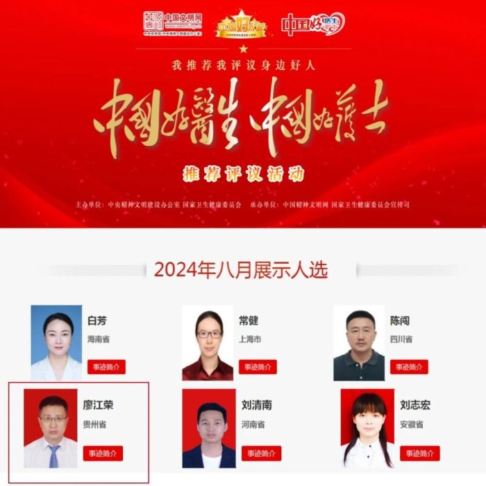 近日,由中央精神文明建设办公室和国家卫生健康委联合开展的“我推荐我评议身边好人”之“中国好医生、中国好护士”2024年8月月度人物网上评议环节正式启动。经广大群众热情推荐线索、各省(区、市)卫生健康委认真审核报送,2024年8月共有51位展示人选接受评议。国家卫生健康委官网及“健康中国”新媒体平台进行“中国好医生、中国好护士”人选事迹展示和评议。贵阳航天医院呼吸与危重症医学科带头人,主任医师廖江荣入选8月展示人选。