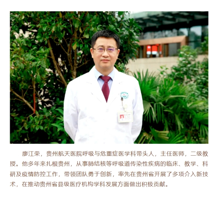 自2003年廖江荣担任医院呼吸与危重症医学科学科带头人以来,他带领科室构建了以呼吸危重症和呼吸病介入技术为强力推手,以肺部感染性疾病、肺癌、肺小结节的早期精准诊疗和慢性呼吸疾病康复治疗为特色,以人才团队建设为核心的发展模式,将科室发展成为贵州省治疗规模最大、诊疗项目最全的呼吸疾病品牌科室。作为中国志愿医生专家组成员,他积极通过“义诊、扶贫、救灾”等方式,精准支援贫困地区医疗机构建设,救助弱势病患群体,多次赴云南、四川等地开展义诊巡诊、带教查房、健康科普等志愿活动。