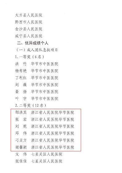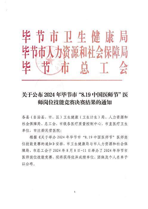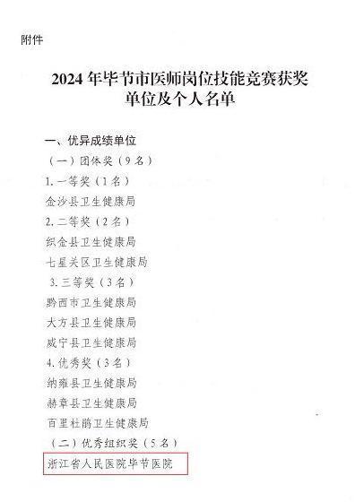 近日,笔者从毕节市卫生健康局下发的《关于公布2024年毕节市“8·19中国医师节”医师岗位技能竞赛决赛结果的通知》中获悉,浙江省人民医院毕节医院(以下简称“浙毕医院”)在由毕节市卫生健康局、毕节市人力资源和社会保障局、毕节市总工会共同举办的2024年毕节市“8·19中国医师节”医师岗位技能竞赛中荣获优秀组织奖,21名医务人员荣获个人单项奖。