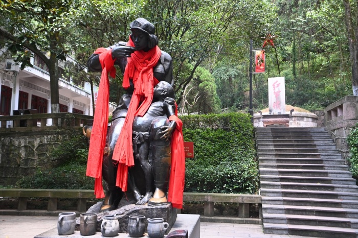 马偲峻一家拜祭的铜像,是一位红军卫生员给一个骨瘦如柴的病童喂药的形象,铜像的后方坐落着一冢“红军坟”。