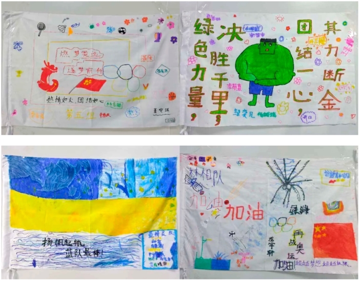 开班第一课,孩子们自由组合成了5个小组,热烈讨论着各自小组的队旗设计及口号。第一小组以奥运精神为主题,设计了五环交织的队旗,口号是“燃梦奥运,逐梦前行”;第二小组则绿巨人为灵感,创作了强壮有力的队旗,口号是“绿色力量,决胜千里”;第三小组带来了蔚蓝灿烂的星空队旗,口号是“扬帆起航,蓝队必胜”;第四小组把祖国绘制在队旗上,口号是“加油!加油!再战奥运”;第五小组的队旗上向日葵向阳盛开,口号是“向阳而生”!孩子们充分发挥了非凡的想象力,用彩笔描绘出心中的梦想与希望,每一面队旗都凝聚着他们的智慧与汗水,充满了力量与鼓舞。