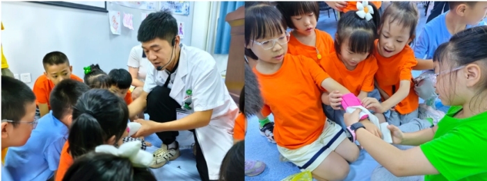 在急救常识课上,孩子们学习了心肺复苏、止血包扎等急救技能,这些技能在未来的生活中可能会成为他们保护自己和他人生命的重要工具。