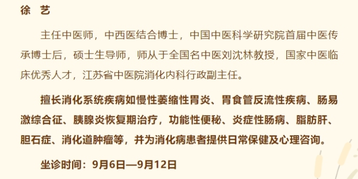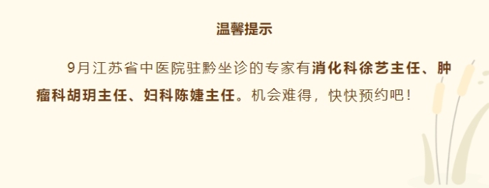 首页 > 新闻中心 > 卫生工作动态 > 正文 名医堂|9月江苏省中医院消化科、肿瘤科、妇科驻黔坐诊专家信息 来源:贵州健康报 时间:2024-08-30 浏览次数: 坐诊时间及预约挂号坐诊时间:徐 艺9月10日(周二)上午胡 玥7月—9月陈 婕9月11日(周三)上午9月13日(周五)上午9月18日(周三)上午9月20日(周五)上午预约方式:方法一:电话预约挂号0851-82269999方法二:扫码预约挂号医院微信公众号医院微信小程序(来源:贵州医科大学附属肿瘤医院)编 辑:向 烨二 审:毕 锋三 审:赵 亮 分享到:
