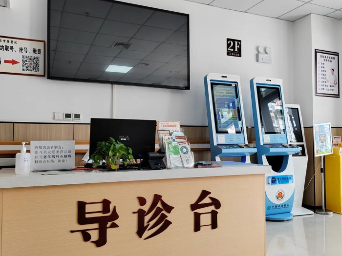 在绥阳县中医医院门诊部一楼大厅,患者们正在导诊台旁边使用设备进行扫码挂号就诊,工作人员正耐心地为患者答疑解惑,帮助他们完成挂号和缴费。