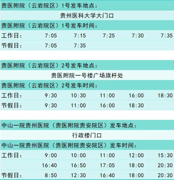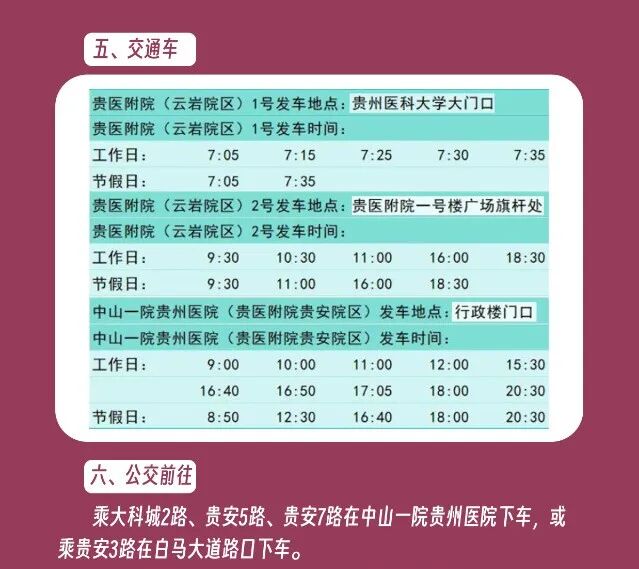 首页 > 新闻中心 > 卫生工作动态 > 正文 更方便!贵医附院到中山一院贵州医院(贵医附院贵安院区)通勤专线开通啦! 来源:贵州健康报 时间:2025-01-16 浏览次数: 为进一步优化通勤服务,提升患者就医体验,方便患者跨院区就诊,1月15,医院开通贵医附院到中山一院贵州医院(贵医附院贵安院区)通勤车,为患者提供更加优质的服务。此外这里还有一份到中山一院贵州医院的交通指南请注意查收(来源:中山一院贵州医院)编 辑:石 磊二 审:杜 明三 审:赵 亮 分享到: